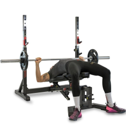 Bench with 4-tier adjustable back and 3-tier seat for a variety of strength training exercises with expandable. Equipped with stands with steel construction, 6-position height adjustment and J-hook handles. Dimensions 65x123.5x169 cm, weight 40 kg, max load 150 kg.