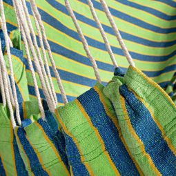 - Hammocks were sewn with thick polyester thread, dyed type 9, used in the production of demanding sports equipment. Stitched envelopes are permanently connected by regularly interlaced strips. Each belt laid along the length of the hammock along with the handle elements is wrapped against the stiffener means that the webbing is banded against the stiffener.