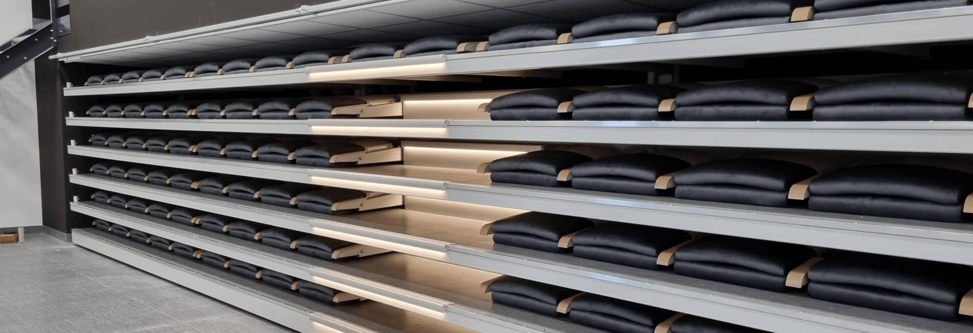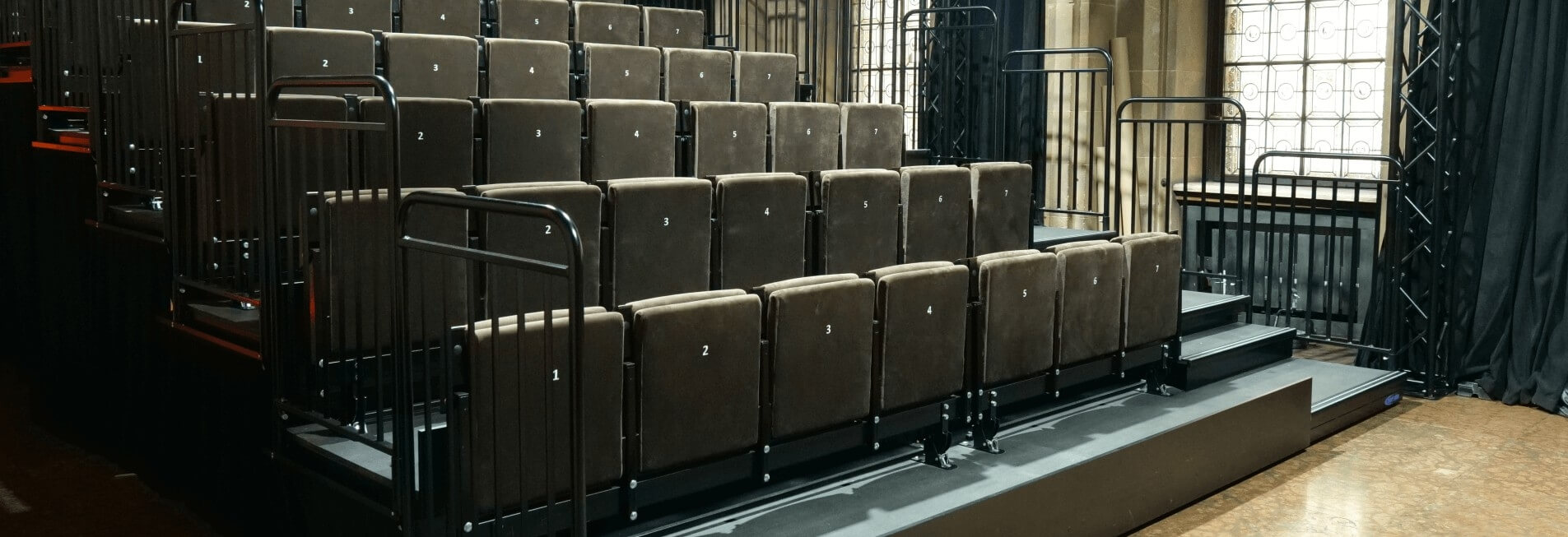 Telescopic tribunes with upholstered seats, electrically controlled ocotation, stage truss systemAnimation Theater, Poznan, Poland -