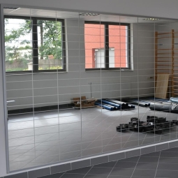 Lustro gładkie przyścienne z podwójnymi poręczami, szlifowane maszynowo, o grubości 4 mm. Mocowane elastyczną taśmą do płyty wiórowej. Dostępne ze wspornikiem przyściennym lub wolnostojącym. Idealne do sal gimnastycznych, baletowych i tanecznych.